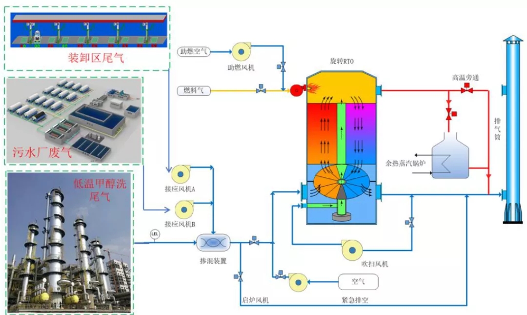 低溫甲醇洗廢氣具有風(fēng)量大、濃度高、近乎零含氧量,需要大量新風(fēng)或?qū)⑽鬯畯S生化池收集的VOCs廢氣、裝卸區(qū)和罐區(qū)排放VOCs廢氣參入稀釋后一同處理,實現(xiàn)整廠綜合治理。
