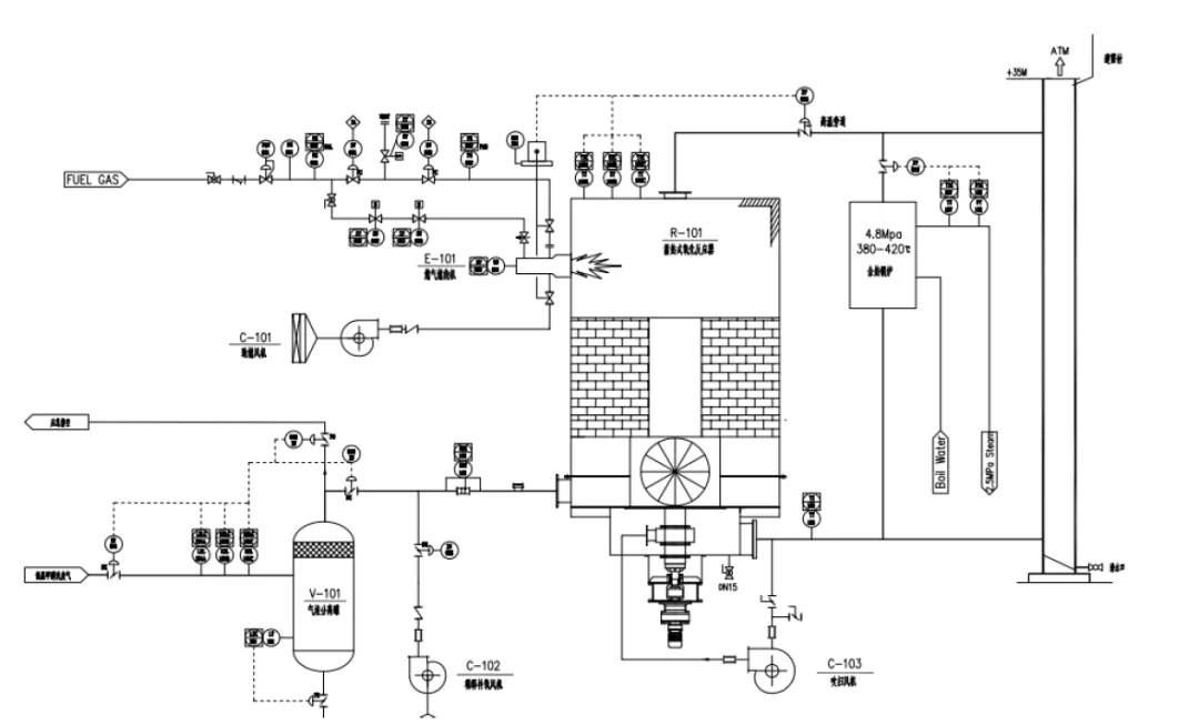 新疆廣匯新能源有限公司煤制液化氣采用Lurgi氣化爐,低溫甲醇洗廢氣量為56000Nm3/h,可燃組分濃度約4.6%,2019年新疆廣匯新能源投運了一套5.6萬方/小時處理量的TO直燃爐設(shè)備,配套50T/h余熱鍋爐,用來治理低溫甲醇洗廢氣。項目總投資8000萬,計劃每年的余熱利用效益1200萬。因為TO直燃爐適合于濃度6%以上的廢氣,在低甲洗VOCs廢氣治理項目上使用能耗非常高,所以新疆廣匯低溫甲醇洗廢氣治理項目投運后,每小時需要伴燒100—200Nm3/h天然氣,經(jīng)濟效益比預(yù)算大打折扣。