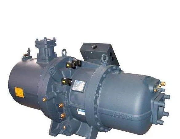 壓縮機和電動機裝在一個由熔焊或釬焊焊死的外殼內(nèi),共用一根主軸,這樣既取消了軸封裝置,又大大減輕和縮小了整個壓縮機的尺寸和重量。露在機殼外表的只焊有吸排氣管、工藝管及其他(如噴淋管)必要的管道、輸入電源接線柱和壓縮機支架等。