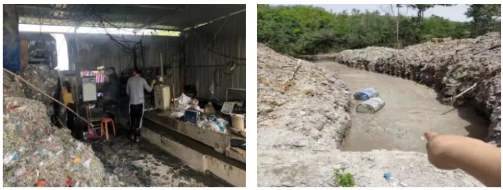 鶴壁市山城區(qū)北唐宋村一廢舊塑料加工點(diǎn),無環(huán)保審批手續(xù),未安裝污染治理設(shè)施,熱熔等加工工段產(chǎn)生廢氣未經(jīng)處理直排外環(huán)境,現(xiàn)場(chǎng)氣味刺鼻;生產(chǎn)過程中產(chǎn)生的廢水也未經(jīng)處理直接排入附近未硬底化的坑塘。